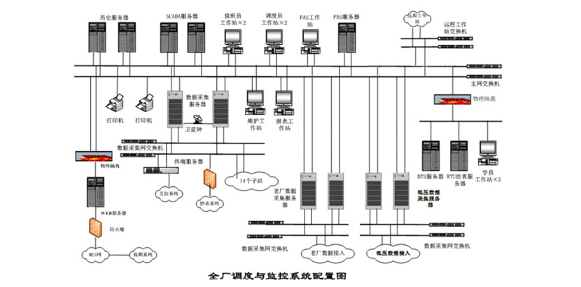 系统网络架构严格遵循能源局及国网公司二次防护要求,计算机采用HP高端PC服务器和HP高端图形工作站,Linux+Windows混合操作系统,东方电子DF8003调度自动化主站监控软件。