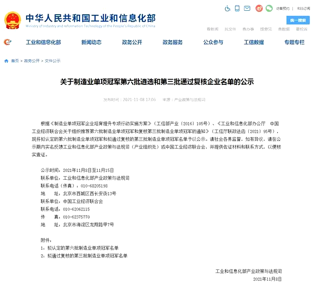 近日,工业和信息化部发布《关于制造业单项冠军第六批遴选和第三批通过复核企业名单的公示》,东方电子旗下威思顿电气(以下简称公司)“10kV高压电能表”成功入选国家第六批制造业单项冠军产品名单。