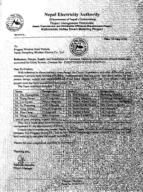 尼泊尔AMI项目结束了当地人工抄表的落后状态,极大改善了尼泊尔电网结构及用电质量,提高企业营收,主流媒体报道称,该项目开启了尼泊尔的智能电网新时代!威思顿海外项目团队凭借着过硬的技术水平、一流的执行能力和出色的服务质量获得了尼泊尔国家电力局的高度认可。2021年底尼泊尔国家电力局主动向威思顿发来项目增补邀请及感谢信,感谢威思顿对尼泊尔国家电力局的大力支持和为尼泊尔电力事业发展做出的突出贡献,这不仅是对威思顿AMI项目产品和系统九游娱乐(中国)官方网站的认可,更是对威思顿“创新驱动,服务全球”精神的高度肯定!