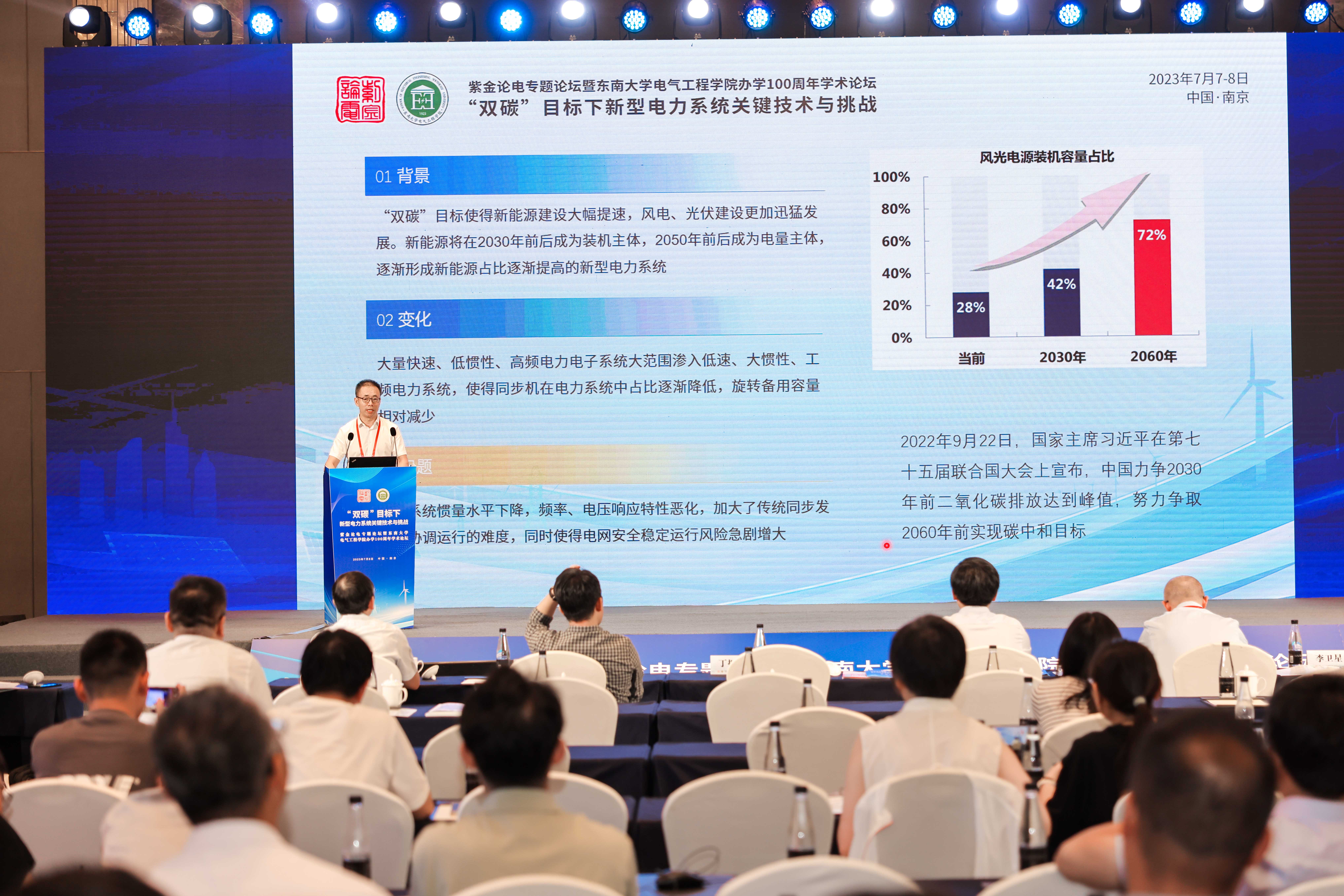 2023年7月8日,由中国电机工程学会电力系统自动化专业委员会指导,国网电力科学研究院有限公司期刊中心和东南大学电气工程学院联合主办的“紫金论电专题论坛暨东南大学电气工程学院办学100周年学术论坛——‘双碳’目标下新型电力系统关键技术与挑战”在江苏南京召开。九游娱乐(中国)官方网站董事长丁振华受邀参加紫金论电专题论坛并作报告。