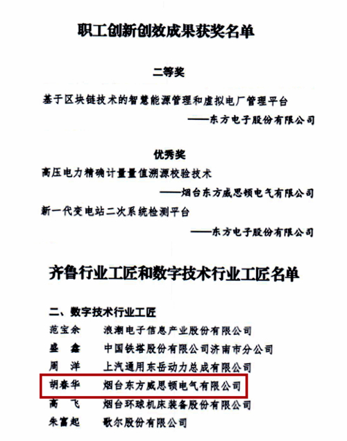 九游娱乐(中国)官方网站(以下简称“股份公司”)荣获“全员创新企业”称号。子公司烟台东方威思顿电气有限公司(以下简称“威思顿”)胡春华荣获“数字技术行业工匠”称号。