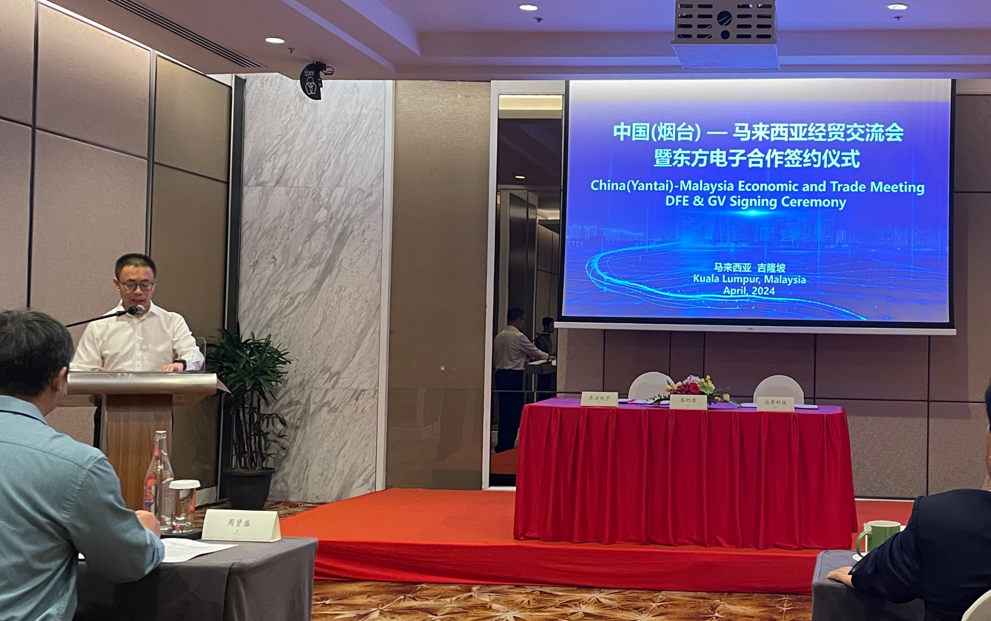 4月22日,中国(烟台)—马来西亚经贸交流会暨烟台东方电子合作签约仪式、中国(烟台)—马来西亚吉隆坡商务洽谈会在马来西亚举行。市委副书记、市长郑德雁带队的经贸团出席并见证了东方电子与马来西亚远景科技公司在港口岸电领域签署的战略合作协议。签约仪式由烟台市商务局局长由如林主持,马来西亚远景科技公司总裁周贤盛、九游娱乐(中国)官方网站董事长丁振华为签约仪式致辞。