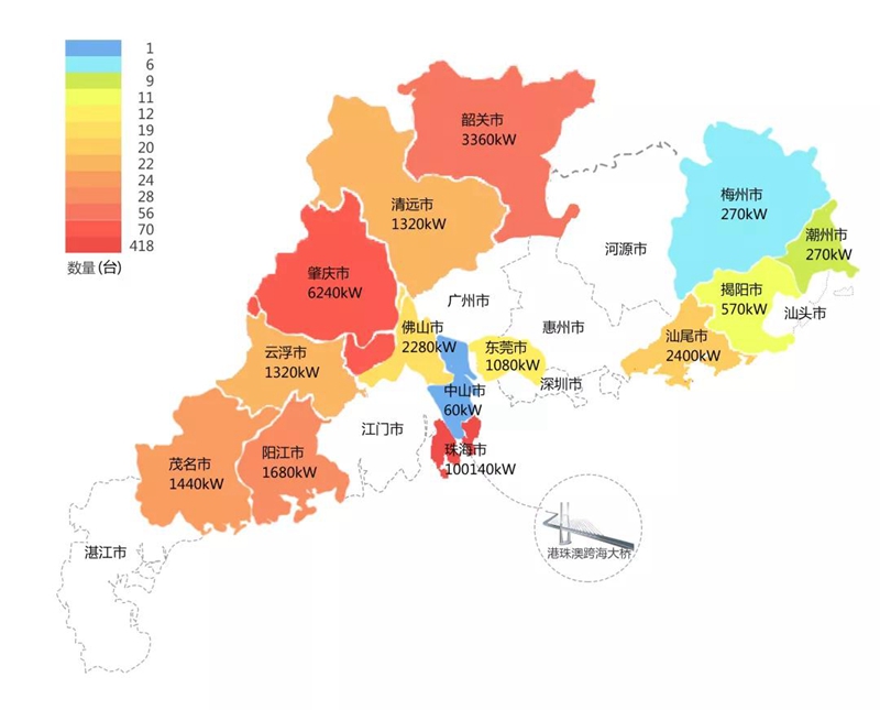 2018年,在港珠澳大桥充电桩项目中,东方电子在港珠澳大桥珠海端口岸人工岛搭建的充电管理平台及电能量采集终端,为大桥的绿色运营和电力保障提供技术支持。除此之外,仅广东省内,东方电子充电桩涵盖肇庆、珠海等14个城市,具体分布情况如下图所示。