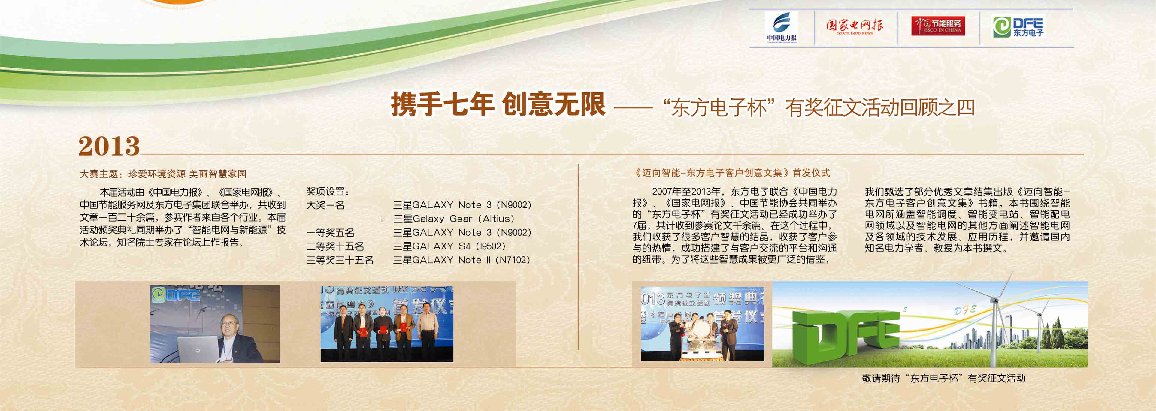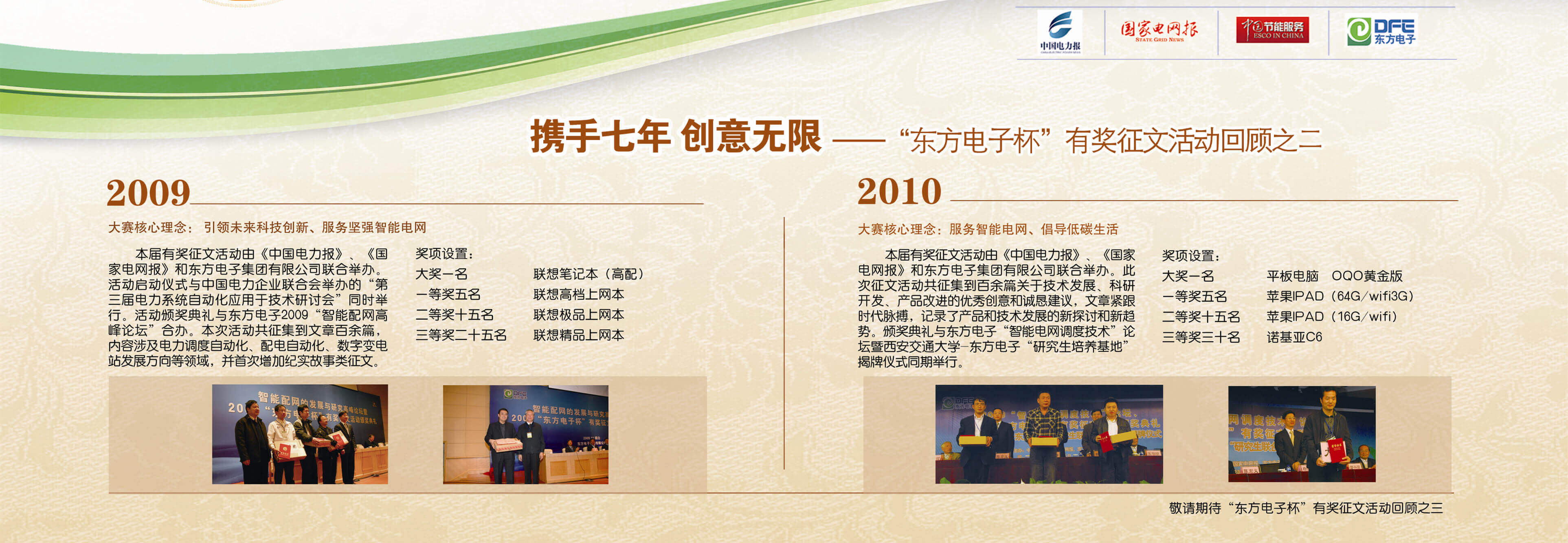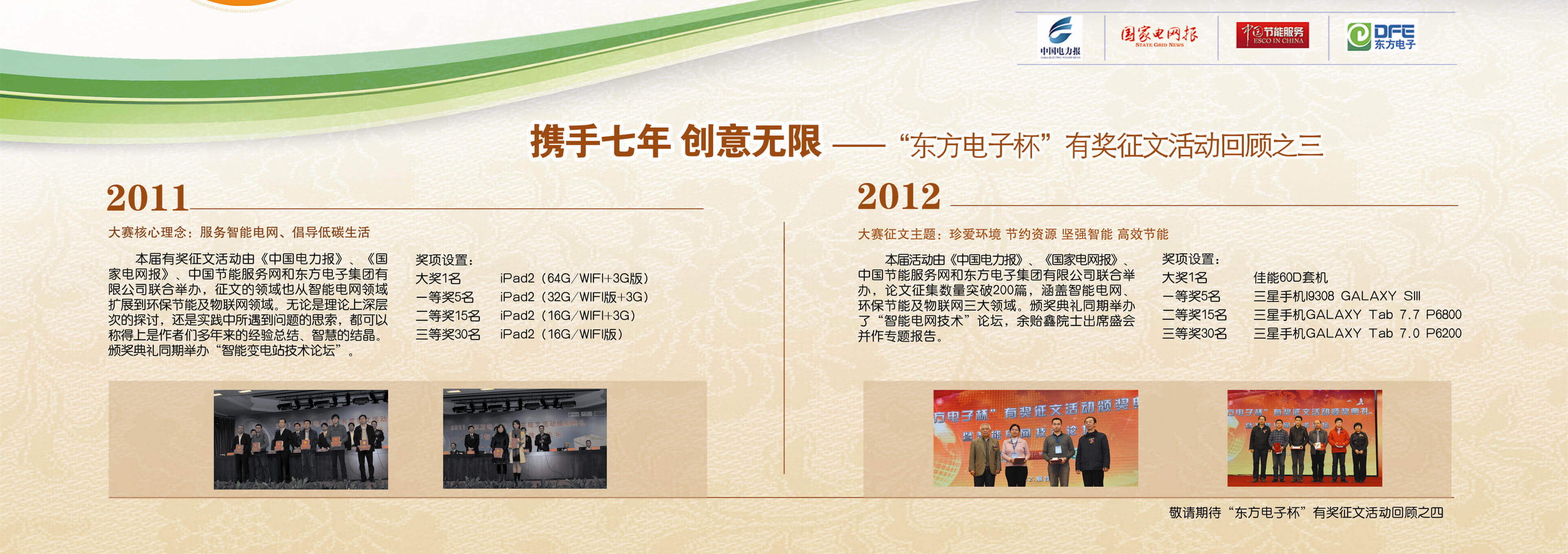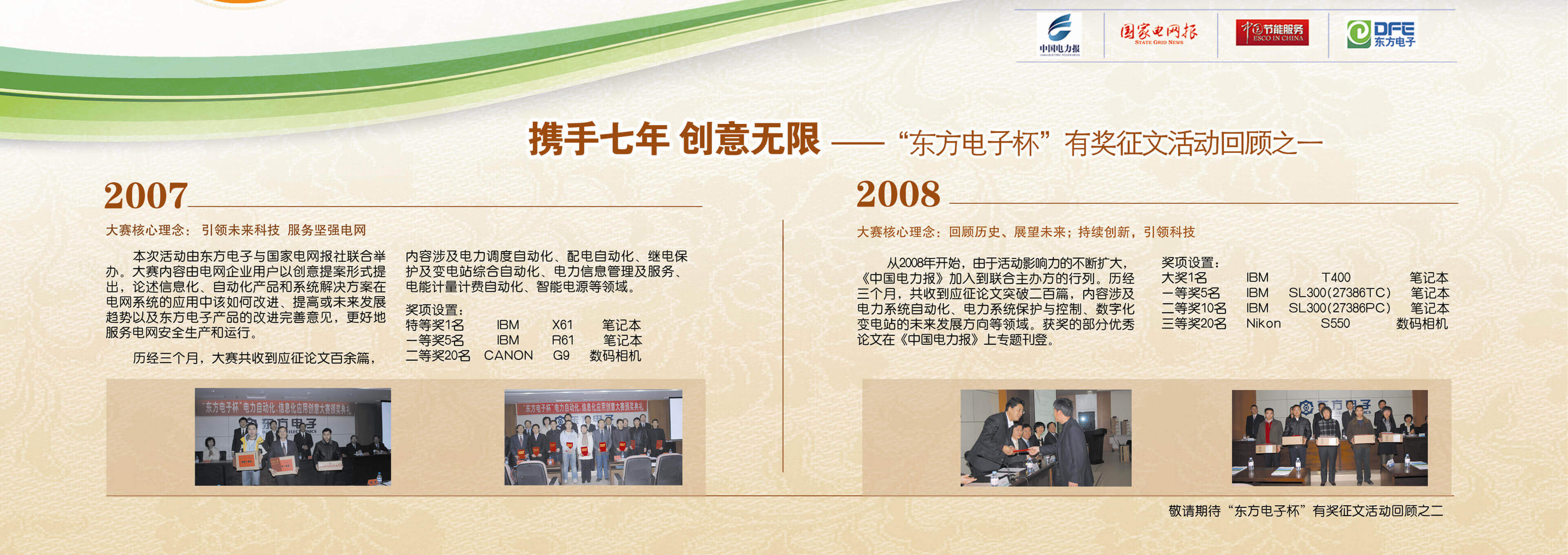2007年至今,由东方电子联合《中国电力报》、《国家电网报》、《中国节能服务》杂志共同举办的“东方电子杯”有奖征文活动已成功举办七届,在这个过程中,九游娱乐(中国)官方网站收获了很多客户智慧的结晶、收获了客户参与的热情,成功搭建了与客户交流的平台和沟通的纽带。