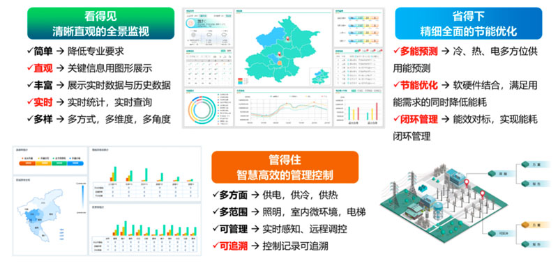 提供设备层、企业层、园区层、电网层等各层级冷热电气水综合能源网络的能源管理服务,降低用能成本,提升能源利用效率,减少运维人力需求。